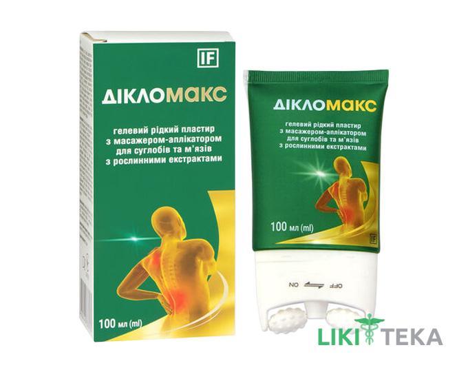 Медичний виріб «Дікломакс» гелевий рідкий пластир з масажером-аплікатором для суглобів та м'язів з рослинними екстрактами 100 мл (ml). Застосовується як допоміжний засіб у складі комплексної терапії, що призначив лікар, для забезпечення зниження больових відчуттів та набряків у м'язах та суглобах, для зменшення дискомфорту, болю і набряку. зазвичай після надмірних навантажень на опорно-руховий апарат, спортивних травм чи забоїв, що проявляються надмірною напругою у м'язах. розтягненнями, зниженням рухливості та утворенням гематом. Масажування у поєднанні із гелевим рідким пластирем знімає м'язову напругу та покращує кровообіг в зоні ураження, сприяє зміцненню м'язів і суглобів, відновленню після травм, усуненню больового синдрому завдяки м'яким протизапальним та знеболювальним властивостям.