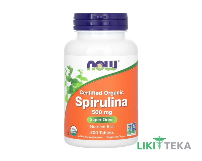 Спіруліна - це синьо-зелена мікроводорость, яка містить натуральний білок, а також такі інші поживні речовини, такі як вітаміни, мінерали та гамма-ліноленову кислоту (ГЛК). Таблетки з спіруліни від Now® мають сертифікат органічного походження і не містять допоміжних і сполучних компонентів або добавок.