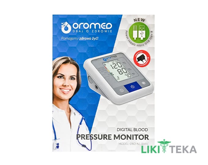 Тонометр автоматичний з адаптером OROMED ORO-N1 BASIC-Z - автоматична цифрова модель, призначена для контролю артеріального тиску і частоти пульсу. Пристрій ORO-N1 BASIC-Z працює по осцилометричному методу вимірювання. Підходить для медичного і домашнього використання. Даний тонометр має дисплей з відображенням дати і часу, пам'ять на 2 блоки по 120 останніх результатів вимірювань, шкалу рівня тиску, функцію усереднення результатів вимірювань, також в комплекті до пристрою передбачено мережевий адаптер.